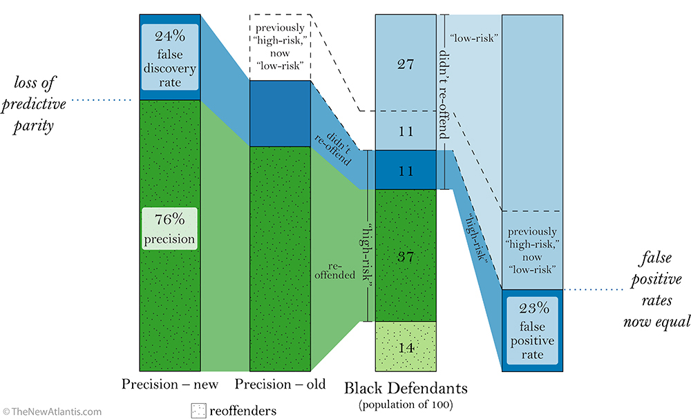 But the central problem persists: None of these analyses say much of anything about what counts as a just level of predictive accuracy. Even if 20 percent predictive precision is better than a random guess, we may still have good reason to reject it as simply too low to justly use in determining someone’s fate. We are asking statistics to meet competing standards of justice while relying on murky intuitions of what those standards are, and without asking whether it is even possible to meet them all at once.