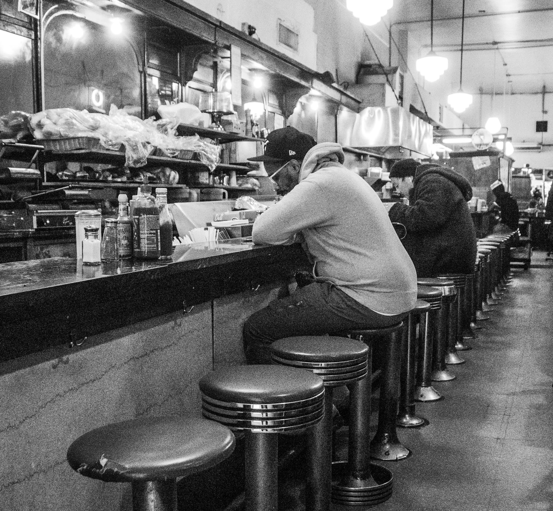 But the aesthetics of the archetypal diner harmonize into a song about home comforts that is always slightly off-key. There are the couch-like booths, their ruptures repaired with duct tape in the make-do fashion of harried relatives. The signage is cozily hand-written, but signs themselves are signs of an institution. The little curtains that nudge the sill next to the booth are strung from a rail halfway down the window. In a diner, you’re always halfway home.