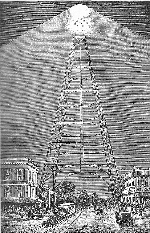 Darkness began to recede significantly in the early days of electric lighting. Arc lighting, which creates illumination by sending a current across two carbon rods, became prominent in the 1870s. It was cheaper and much brighter than gas. Schivelbusch writes that “Unlike all earlier innovations in lighting which had been metaphorically compared to the sun, arc lighting really did resemble sunlight.” It was the first type of lighting to exhibit, in the words of Jakle, “night-destroying brilliance.” Arc lamps generated so much excess heat and glare that they were only suitable for hanging outdoors or in the largest indoor facilities. They could still be found in some American cities as late as the Second World War.