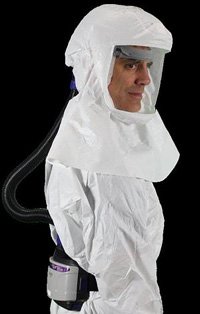 From top to bottom: a surgical mask; an unpowered N95 respirator; and a powered air-purifying respirator (PAPR). Images from Kimberly-Clark, Moldex, and 3M, respectively. Fair use.